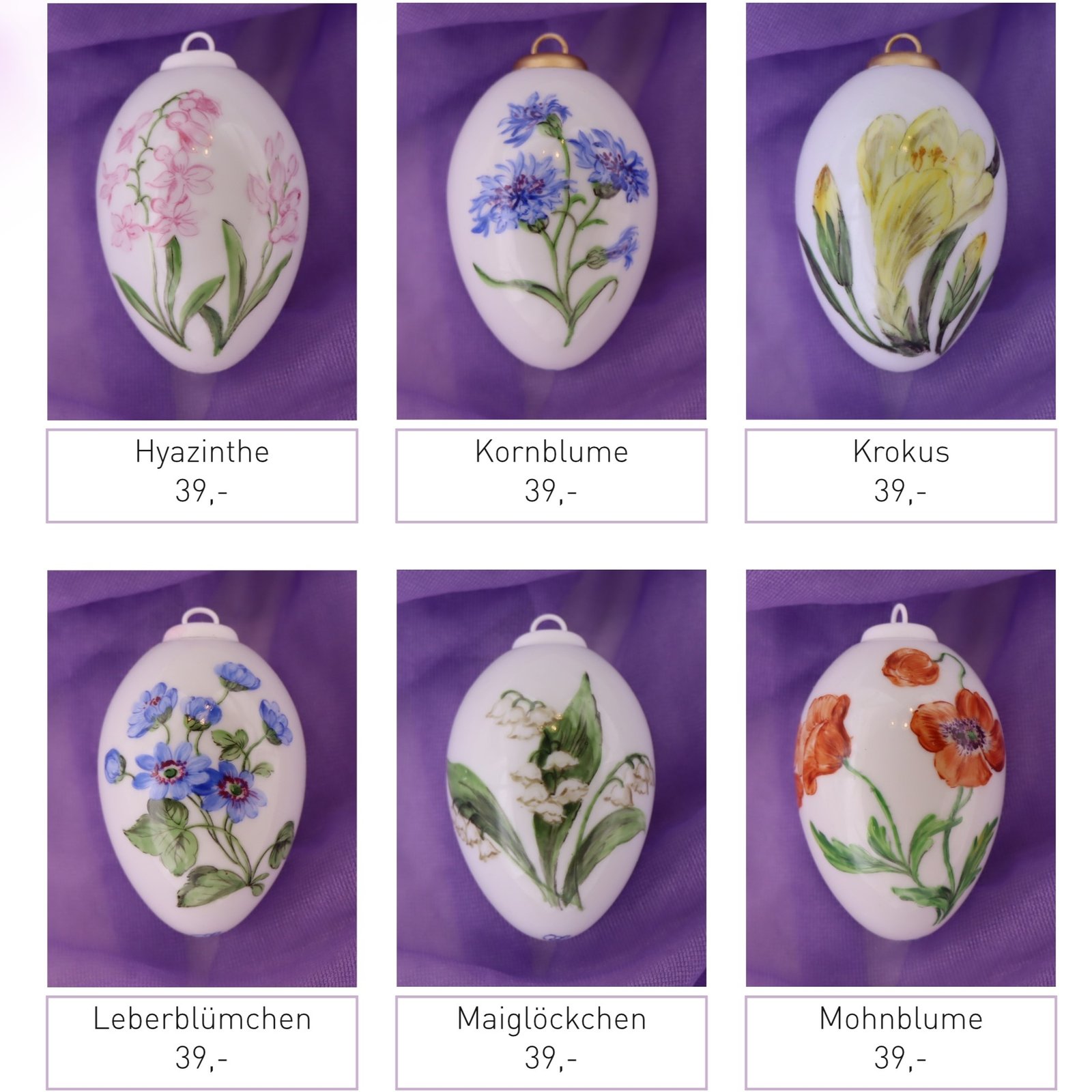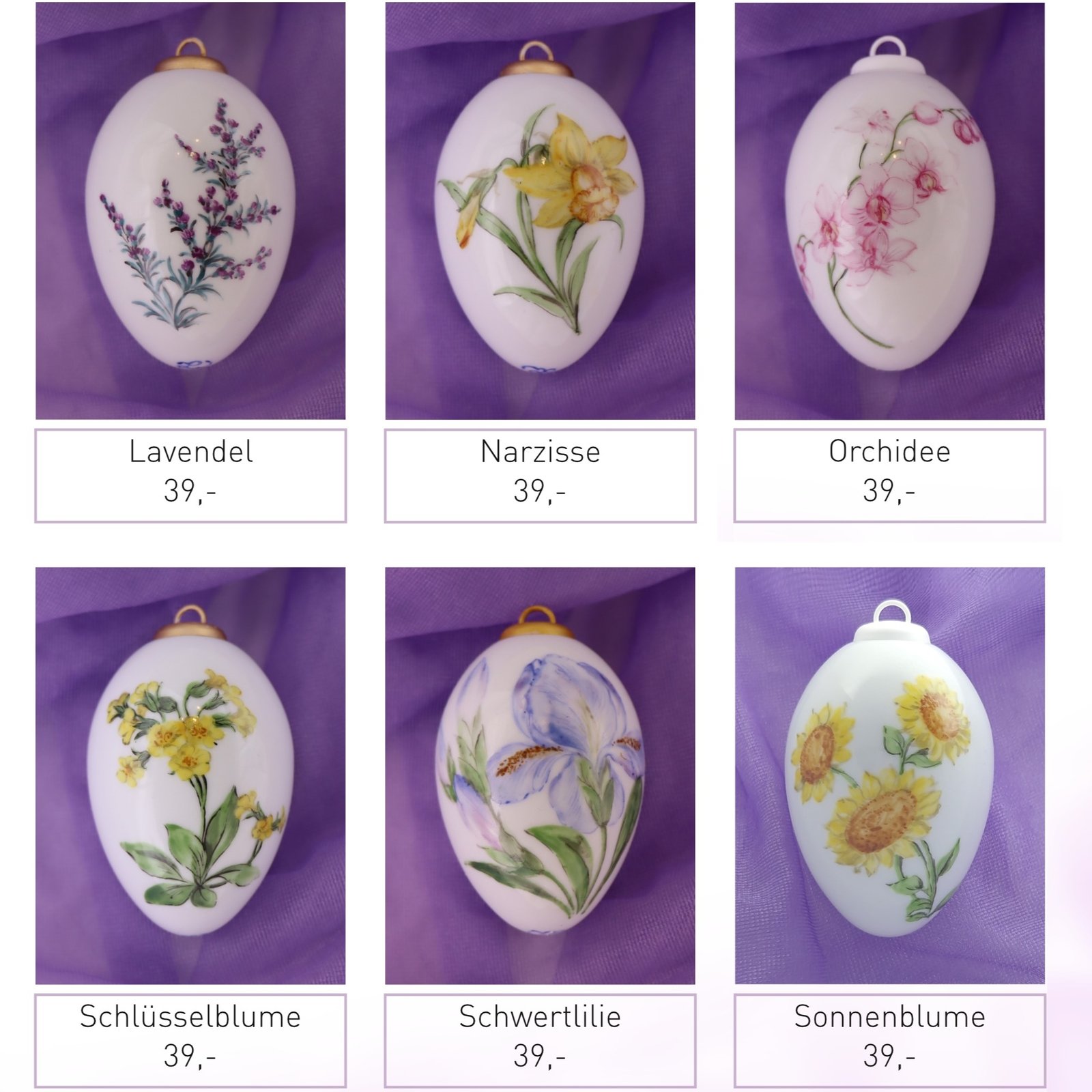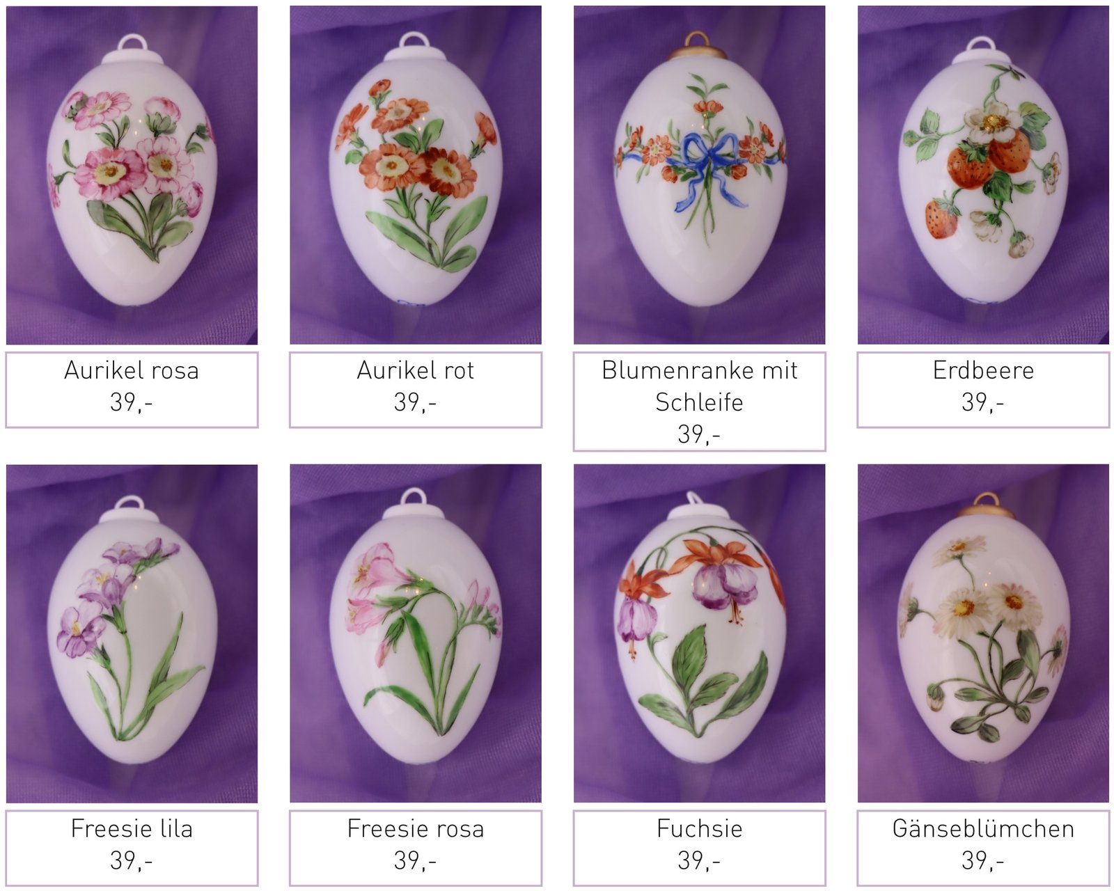 Leichte Porzellaneier zum Hängen, beidseitig mit Blumen bemalt.