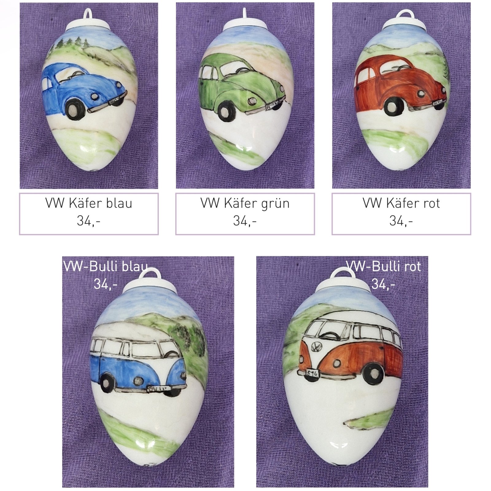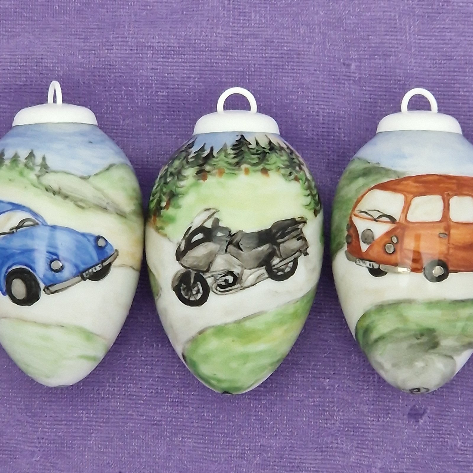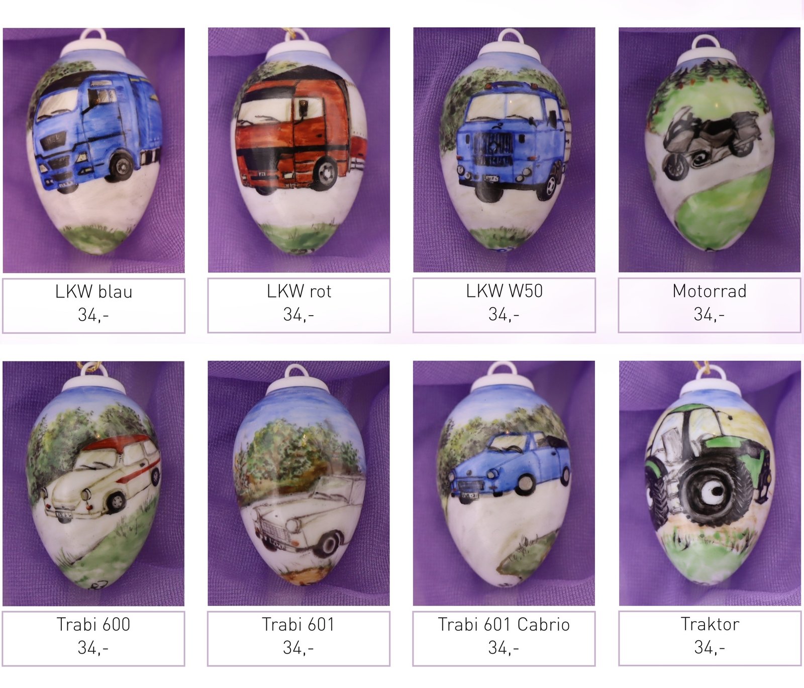 Leichte Porzellaneier zum Hängen, rundum mit Fahrzeugen und Landschaften bemalt.
